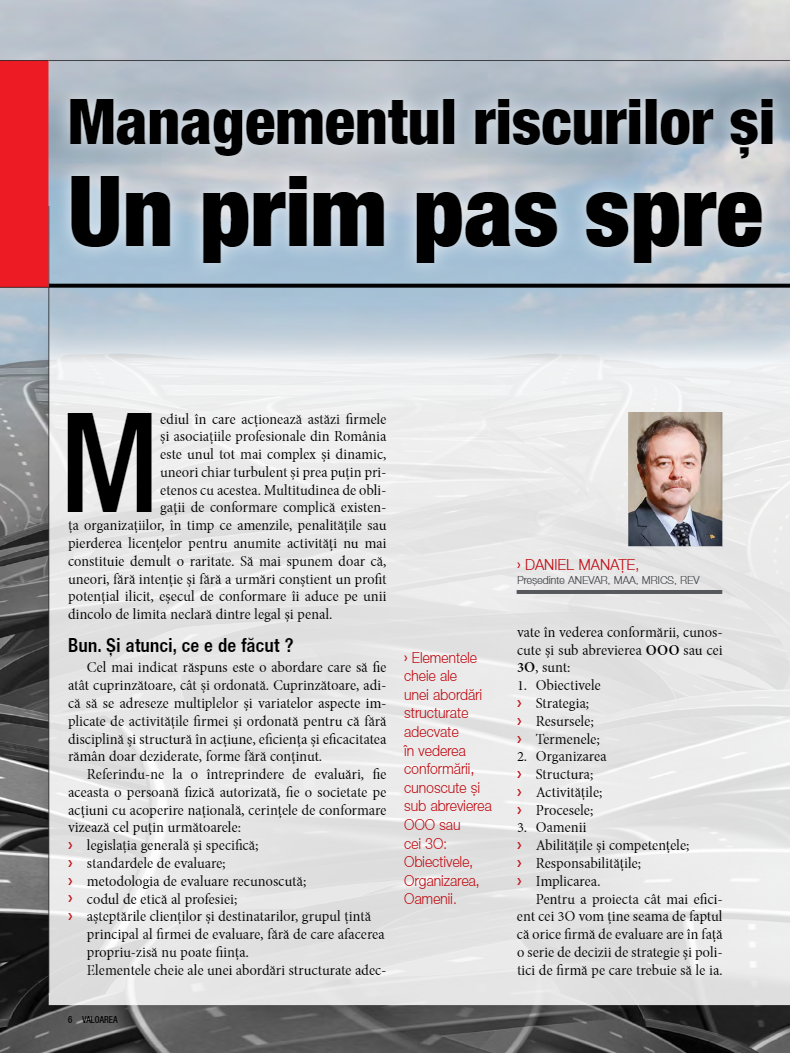 Vă invităm să urmăriții opiniile lui Daniel Manațe, publicate în Revista Valoarea oriunde este ea, nr. 11, și, de ce nu? Să vă inspirați în reorganizarea propriei dumneavoastră afaceri de evaluare preluând ideile care vi se par valoroase din acest material.